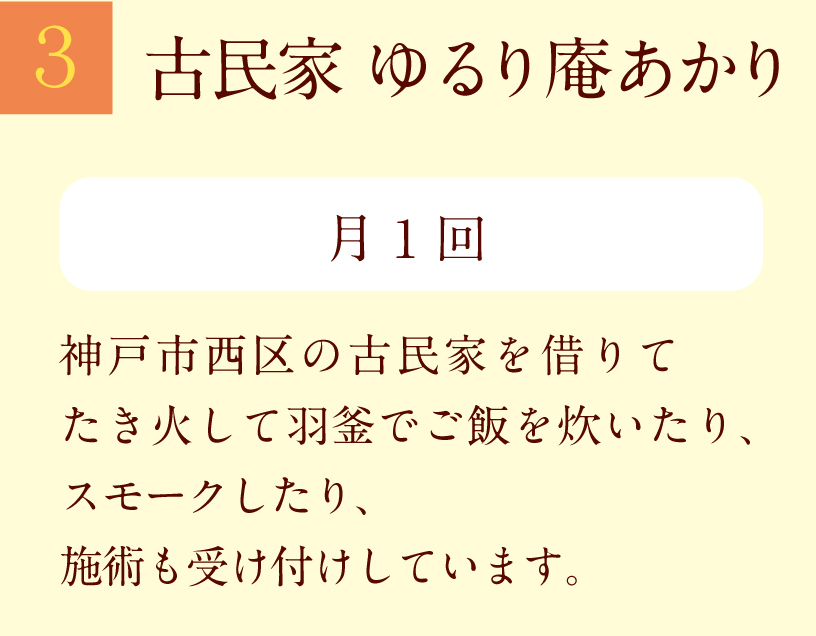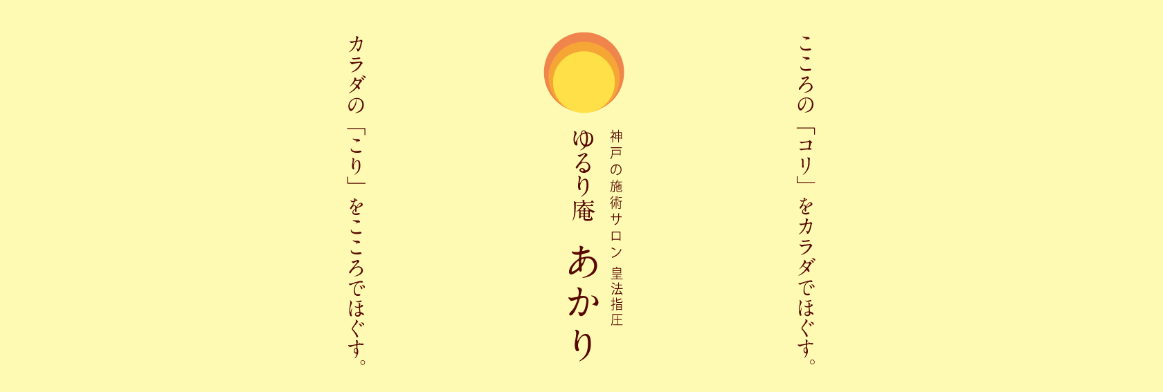 私自身の体調をこわした、その経験を同じ悩みを持っている人に寄り添うことで私も癒され、その人も癒される。受ける側、施術する側の氣が流れて疲れが出ない。 ゆるり庵あかりの「あかり」は、こころとカラダの拠り所になるように、と灯台の光をイメージしてつけました。ロゴマークも和ろうそくの淡いほのおを表現してもらいました。 施術を受ける方の深い呼吸に合わせてカラダにふれますので どんな年齢の方にも安心して受けていただけます。(皇法指圧 施術サロン主宰 高村 典子)