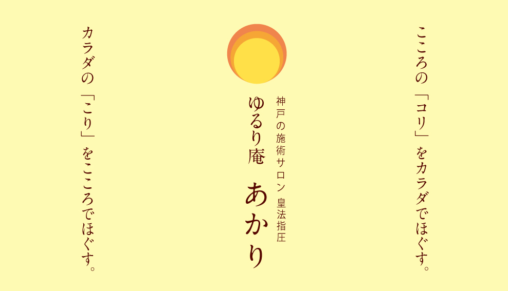 私自身の体調をこわした、その経験を同じ悩みを持っている人に寄り添うことで私も癒され、その人も癒される。受ける側、施術する側の氣が流れて疲れが出ない。 ゆるり庵あかりの「あかり」は、こころとカラダの拠り所になるように、と灯台の光をイメージしてつけました。ロゴマークも和ろうそくの淡いほのおを表現してもらいました。 施術を受ける方の深い呼吸に合わせてカラダにふれますので どんな年齢の方にも安心して受けていただけます。(皇法指圧 施術サロン主宰 高村 典子)